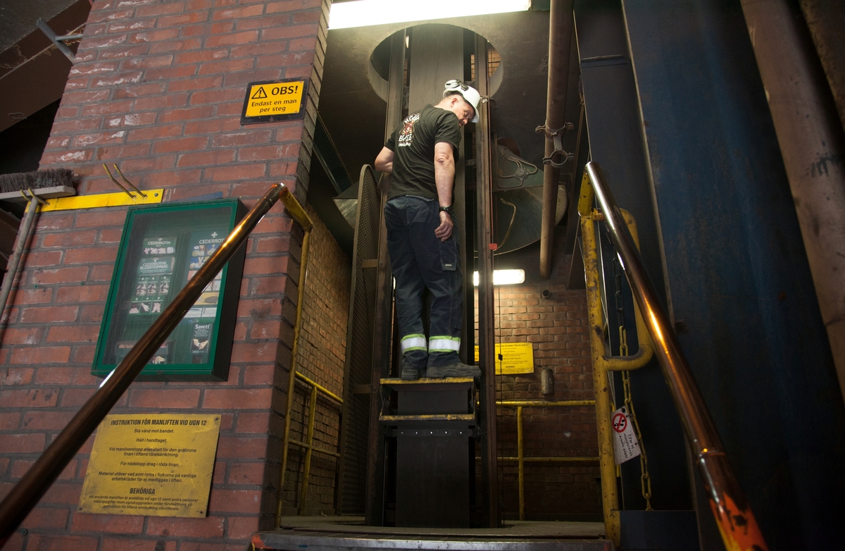 Vargön Alloys AB. Dick Fransson demonsterar hur manliften fungerar
