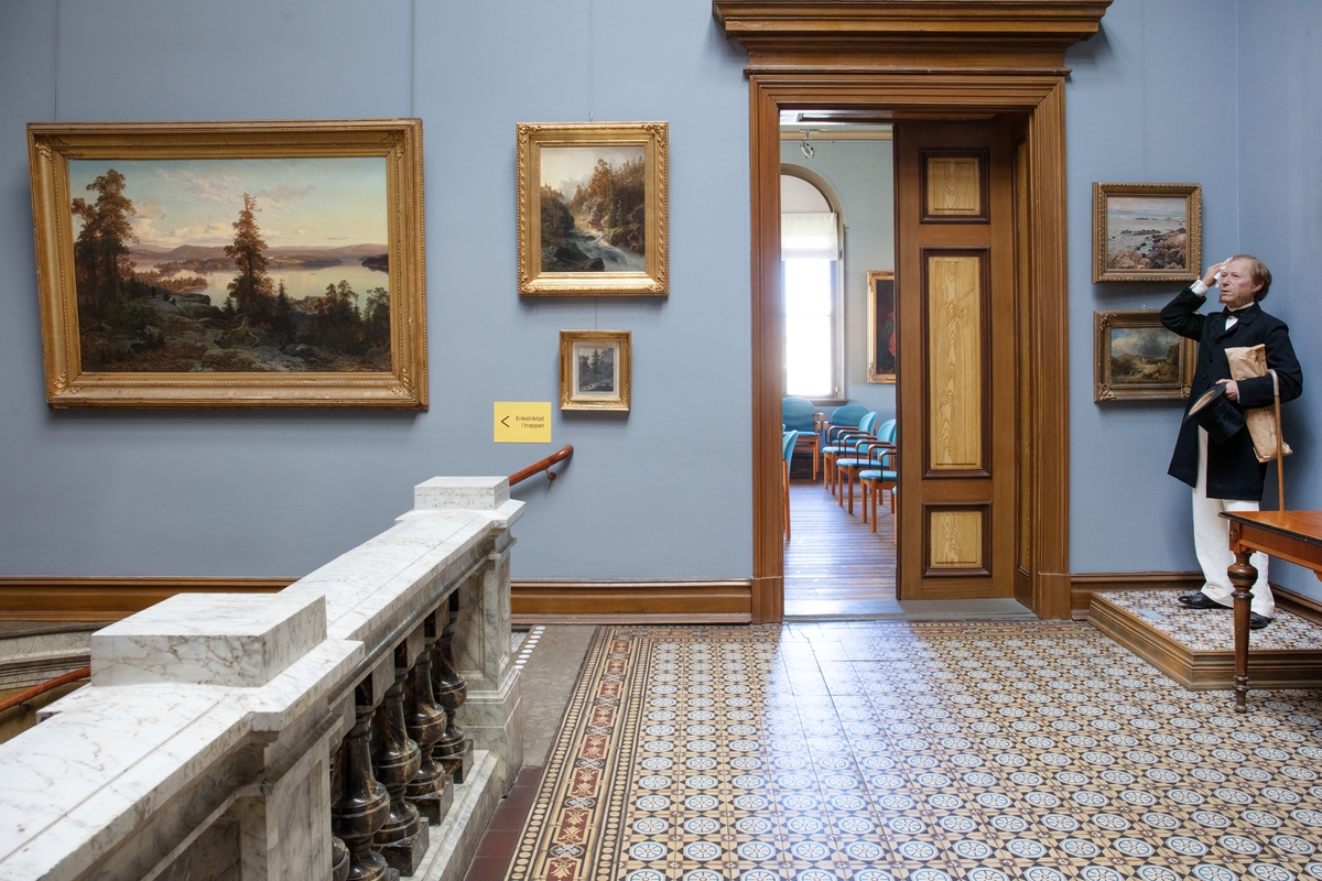 Vänersborgs museum, övre trapphallen. Informationsskylt, enkelriktat i trappan