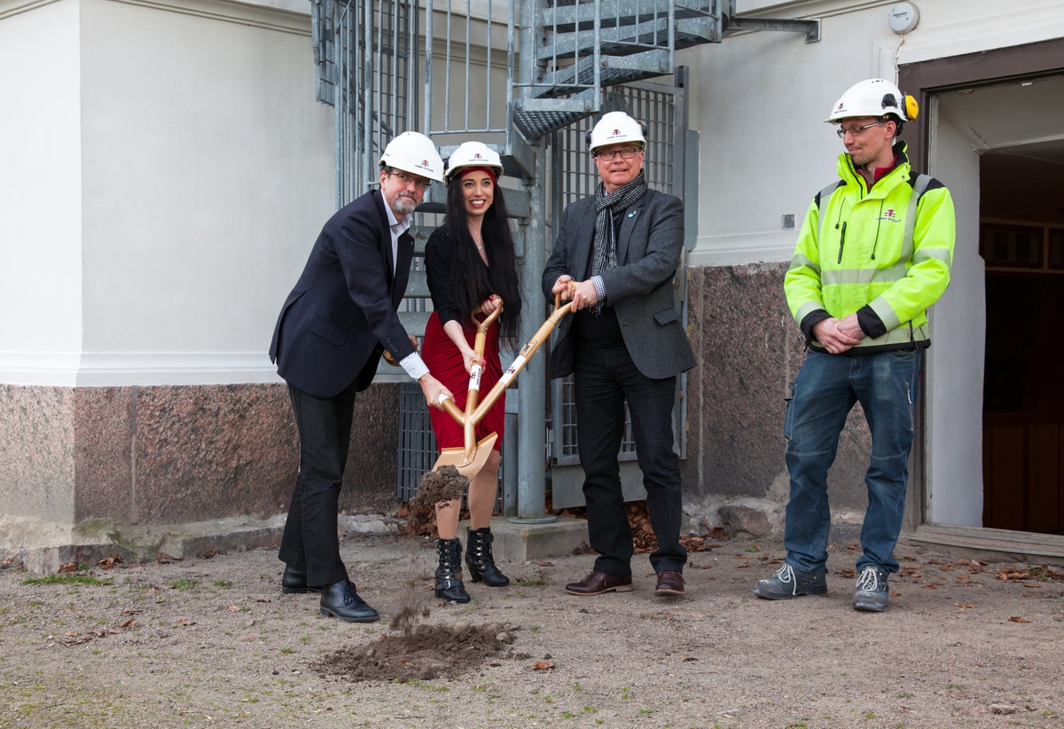 Första spadtaget för hissbygget vid Vänersborgs museum.