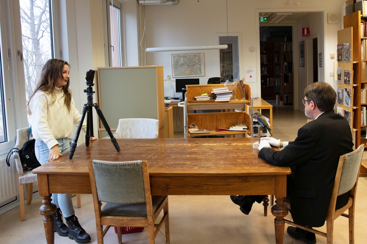 Vänersborgs museum. Kulturlagret, biblioteket. Anna Härdig och Peter Johansson spelar in " fredagsfilm" för museets Facebook och hemsida.