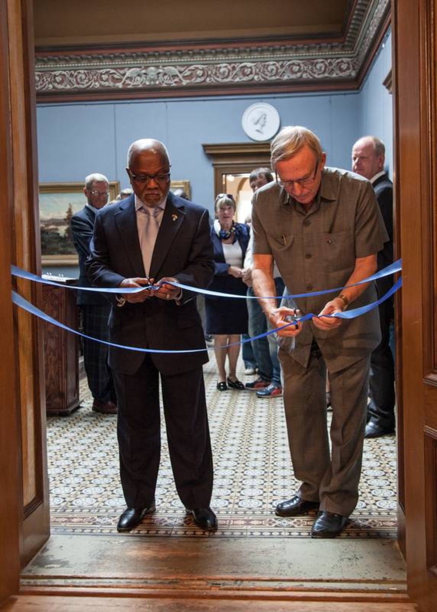 Invigning av utställningen Ambassadör Brito António Sózinho, Embassy of Angola, Stockholm. Sten Rylander, f.d. svensk ambassadör i Angola, Namibia, Zimbabwe och Tanzania.
