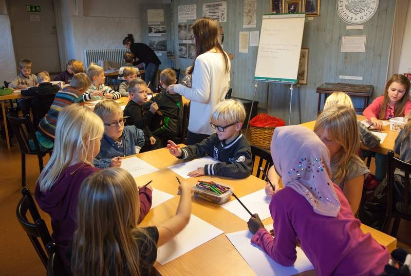 Vänersborgs museums pedagog Jennie Ardin har besök av en skolklass från Rånnumskolan.