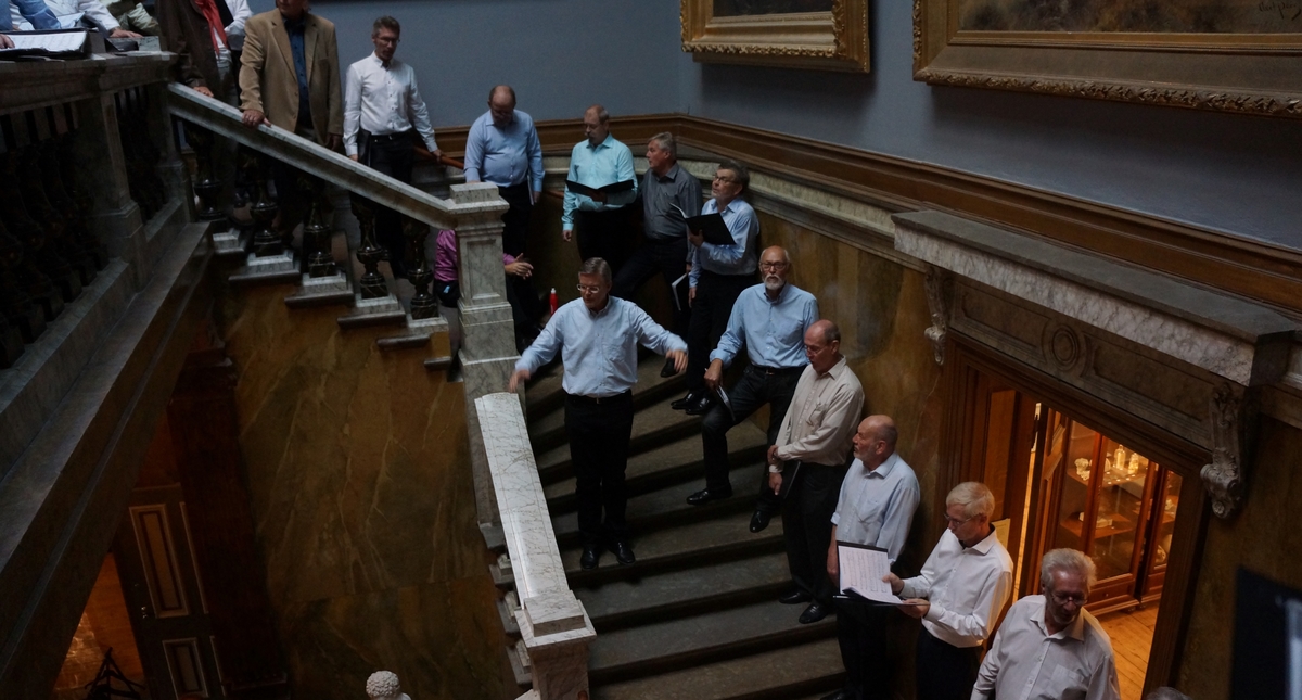 Vänersborgs museum. Par Bricoles manskör ledd av Björn Hård av Segerstad framträder i museet under konserten "Aldrig har de varit bättre Det Lysande Sällskapet Vänersborgs Par Bricole manskör". Avslutningsång i trappan.