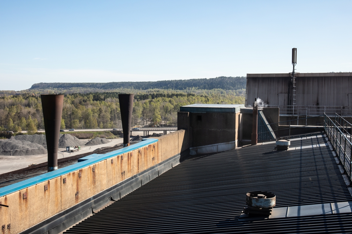 Vargön Alloys AB, utsikt från smältverkets tak. Vägen mellan Vargön och Vänersborg