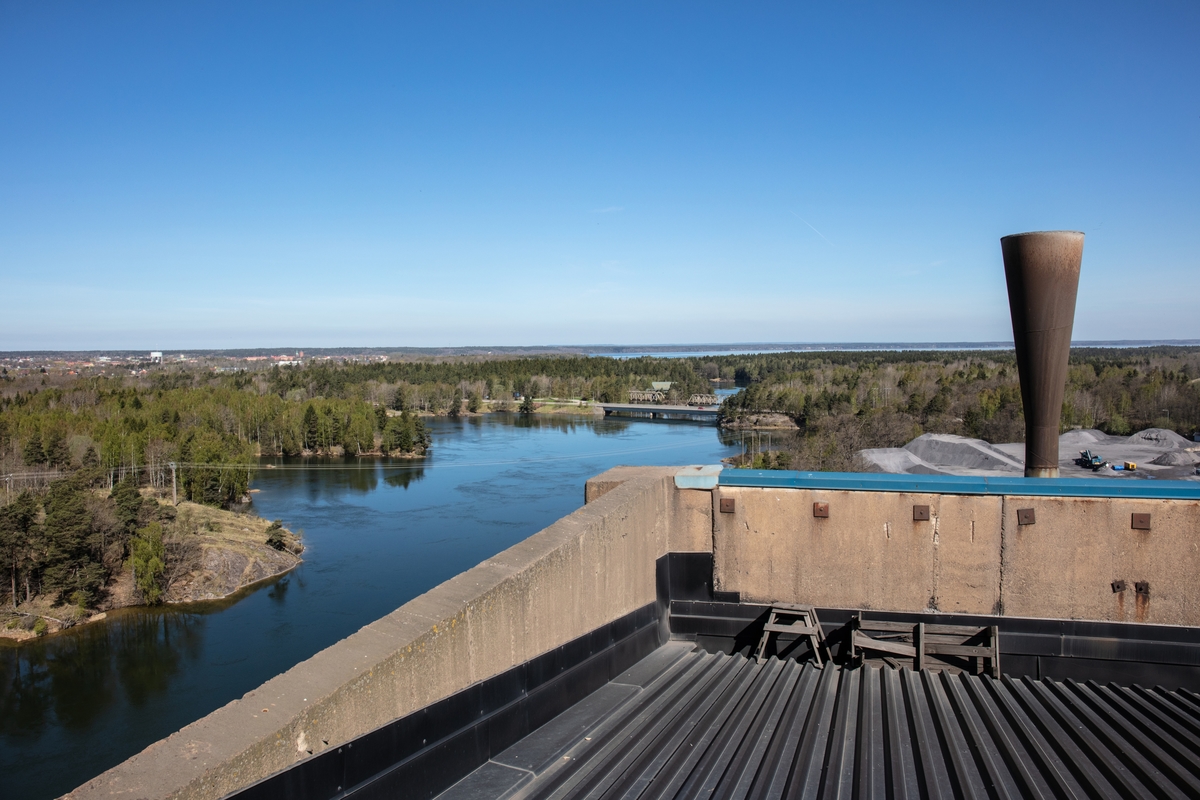 Vargön Alloys AB, utsikt från smältverkets tak. Vänersborg och broar över Göta älv