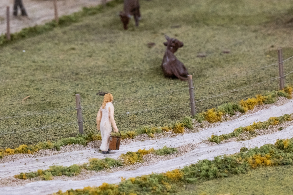 Titel: Dalslandsgård. Vinnsäter, Järbo socken. Detalj av modell, kvinna på väg till brunnen efter vatten