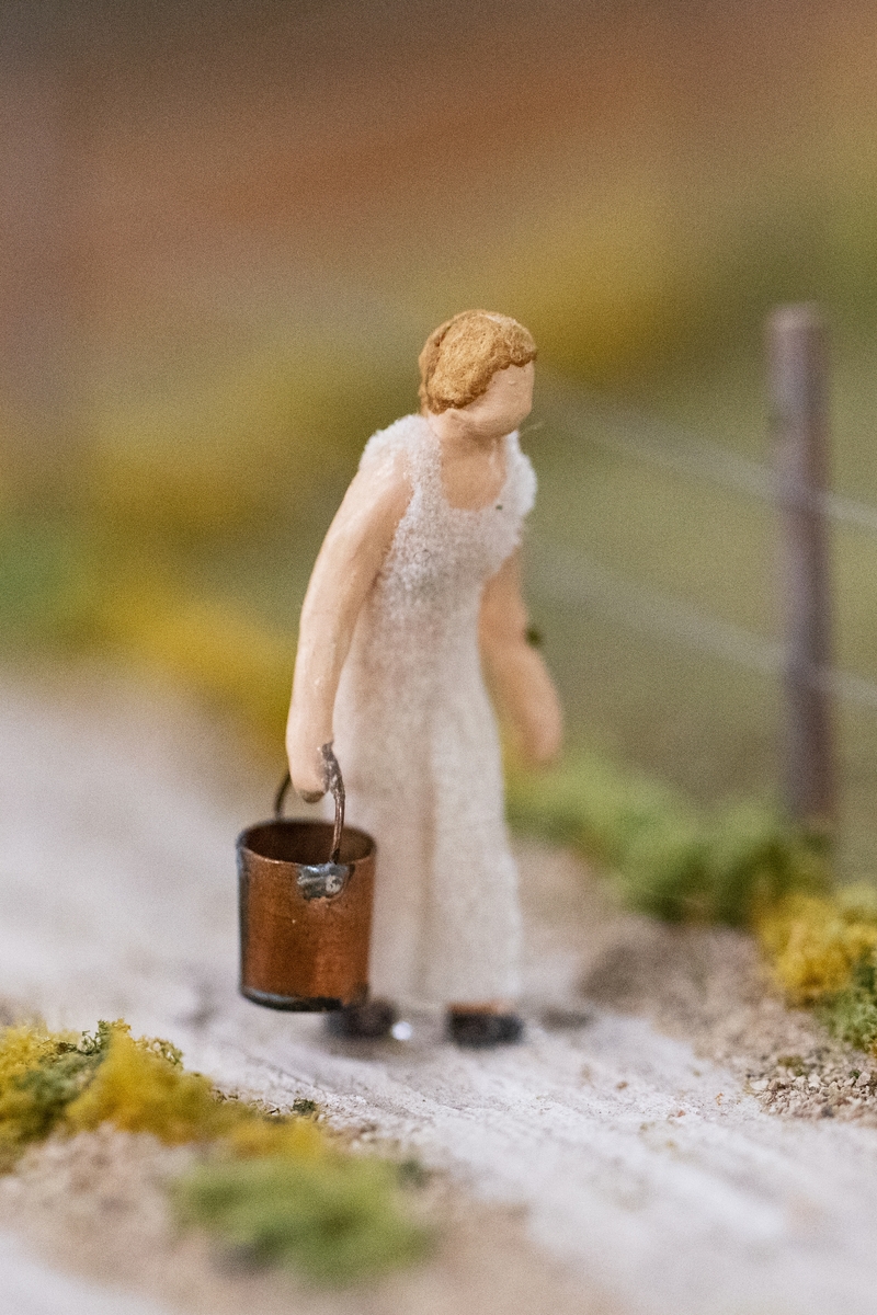 Dalslandsgård. Vinnsäter, Järbo socken. Detalj av modell, kvinna på väg till brunnen efter vatten