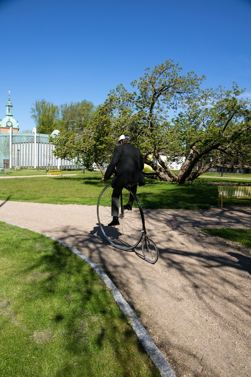 Kvarteret Läroverket. Peter Johansson på höghjuling i parken framför Vänersborgs museum