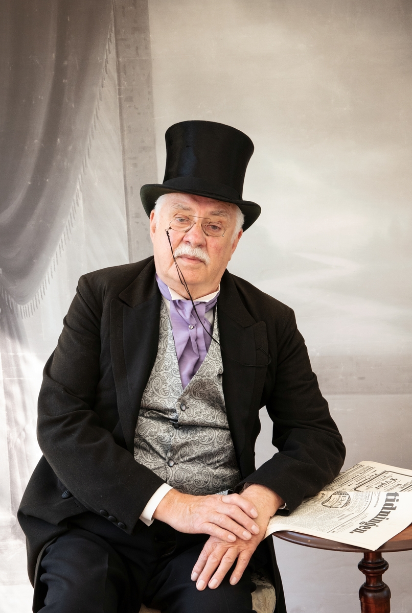 Titel: Vänersborgs museum, 1800-talsdagar. Kuplettcharmören Bo Fureby på besök i fotoateljén