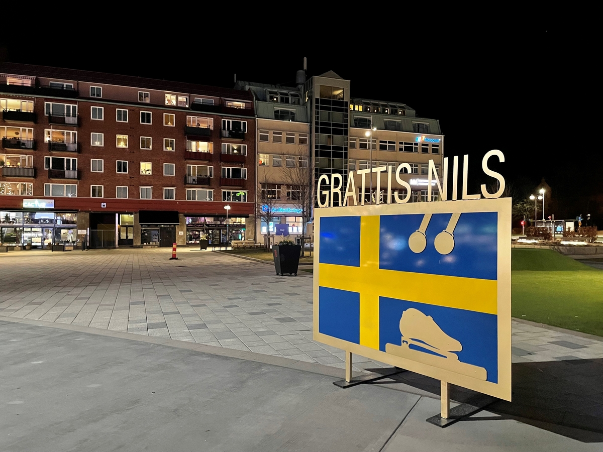 Trollhättan, Drottningtorget. Hyllningsskylt till olympiska mästaren Nils van der Poel