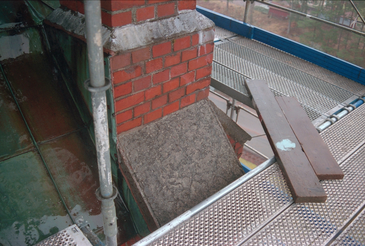 Trollhättans kyrka under pågående renovering, torn, kontrefor, täckning, SV:a hörnet