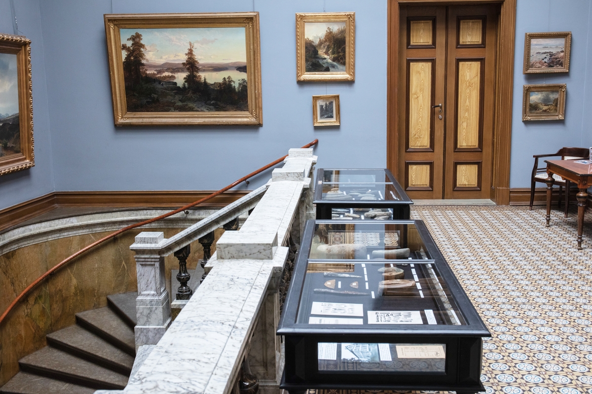 Vänersborgs museum, trapphallen. Utställning om Vänersborgs läroverks fornsakssamling