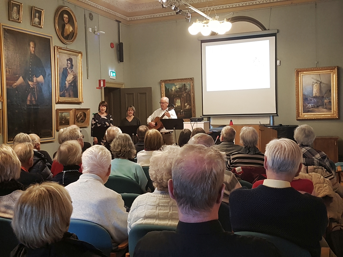 Vänersborgs museum, museets dag 2019. Emeli Holmberg, Johanna Hermansson och Håkan Lind framför visor av Birger Sjöberg.