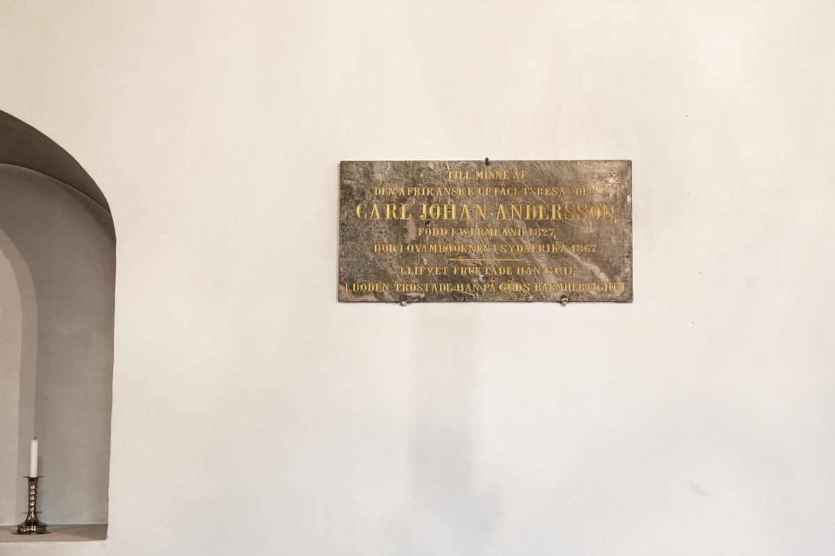 Västra Tunhems kyrka. Minnestavla Carl Johan Andersson/Charles John Andersson