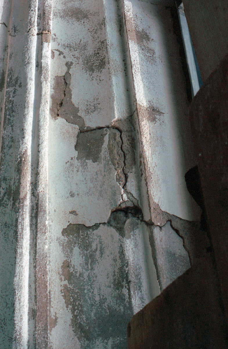Västerlanda kyrka, skadad puts i profileringen, torn.
