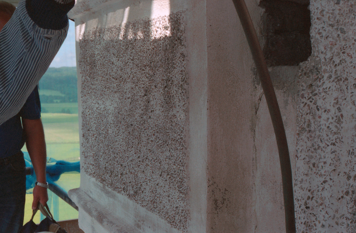 Västerlanda kyrka, torn. Rektangulärt grovputsat parti, blästrat