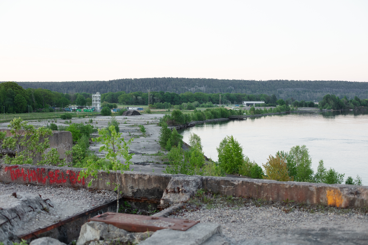 Nedlagda papperbruket i Vargön. Vy över Göta älv och Hunneberg