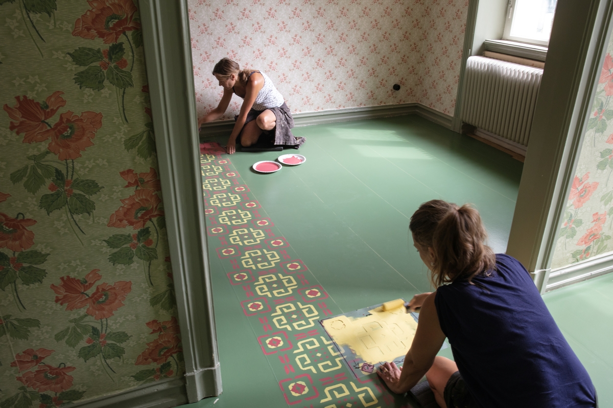 Titel: Vänersborgs museum. Schablonmålning av golvet i vaktmästarbostaden.
