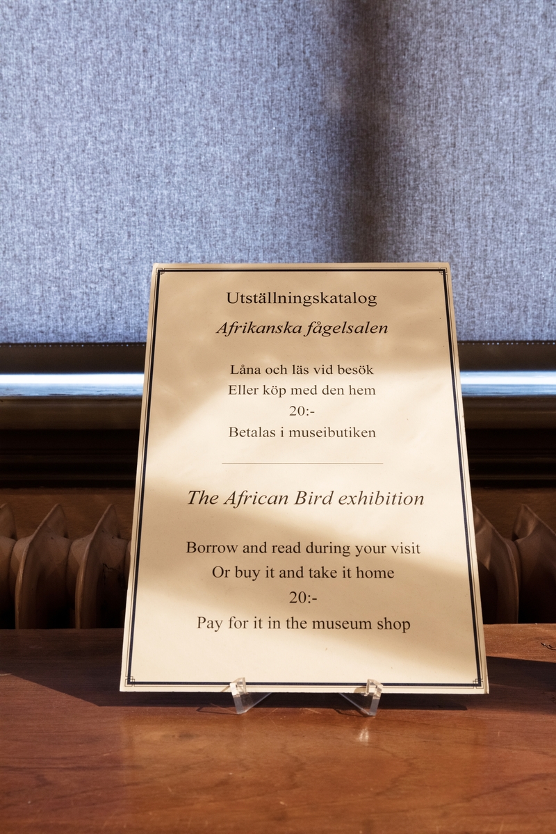 Vänersborgs museum. Afrikanska fågelsalen, skylt på bord med utställningskataloger