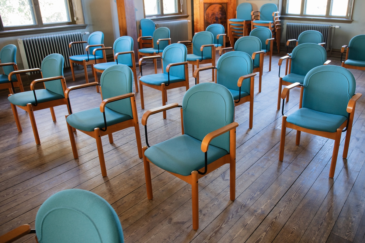 Titel: Vänersborgs museum. Glest placerade stolar i hörsalen