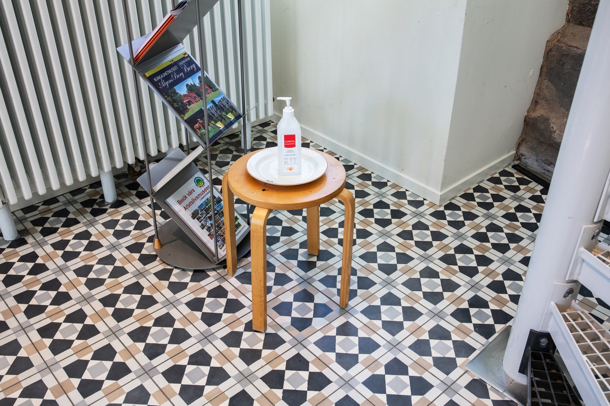 Vänersborgs museum. Handdesinfektion placerad vid entrén, hisshallen