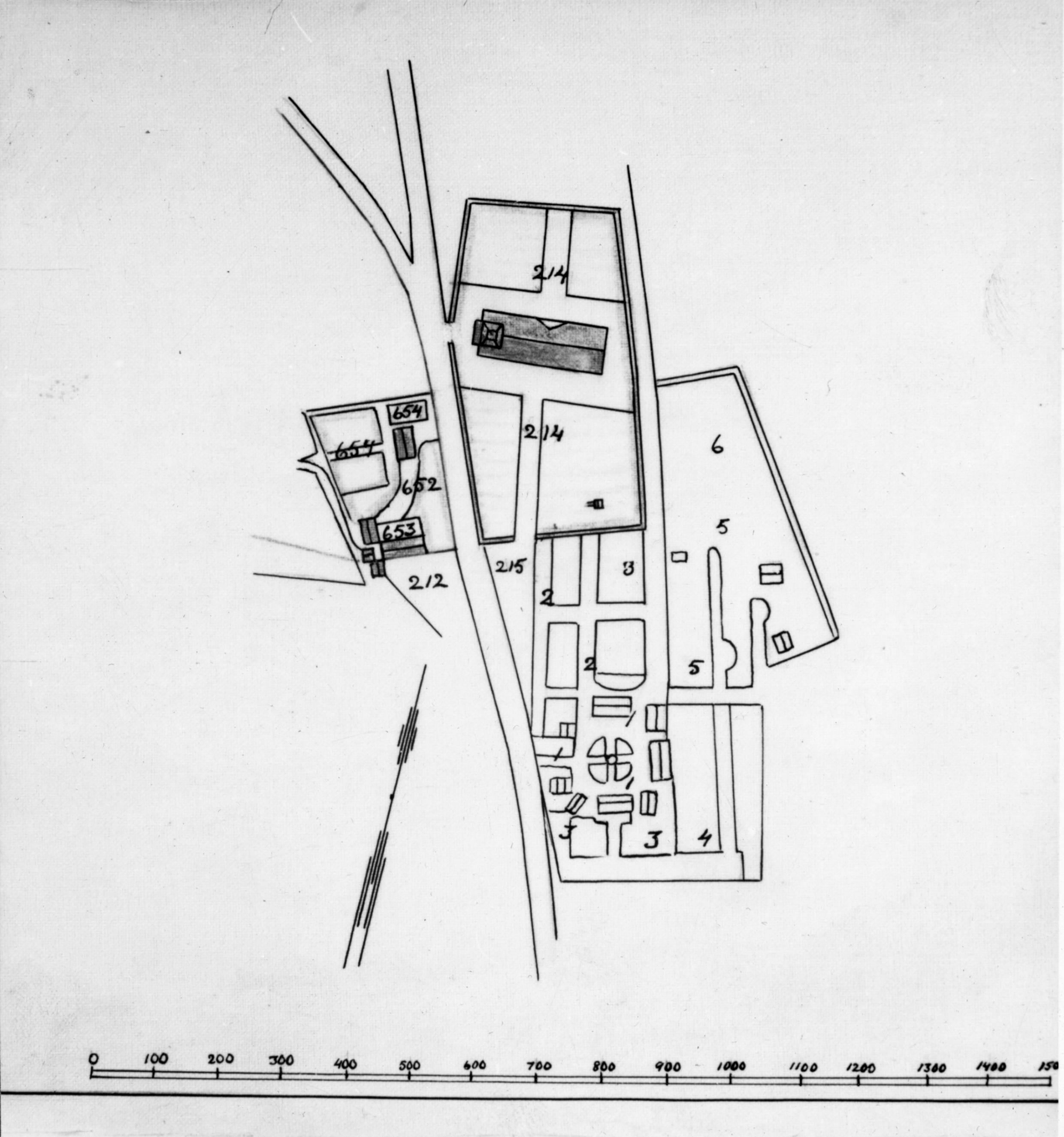 Avfotografering av ritad karta över kyrkans plats av Theodor Romell 1854. Gravkammaren inlagd på kyrkogården.