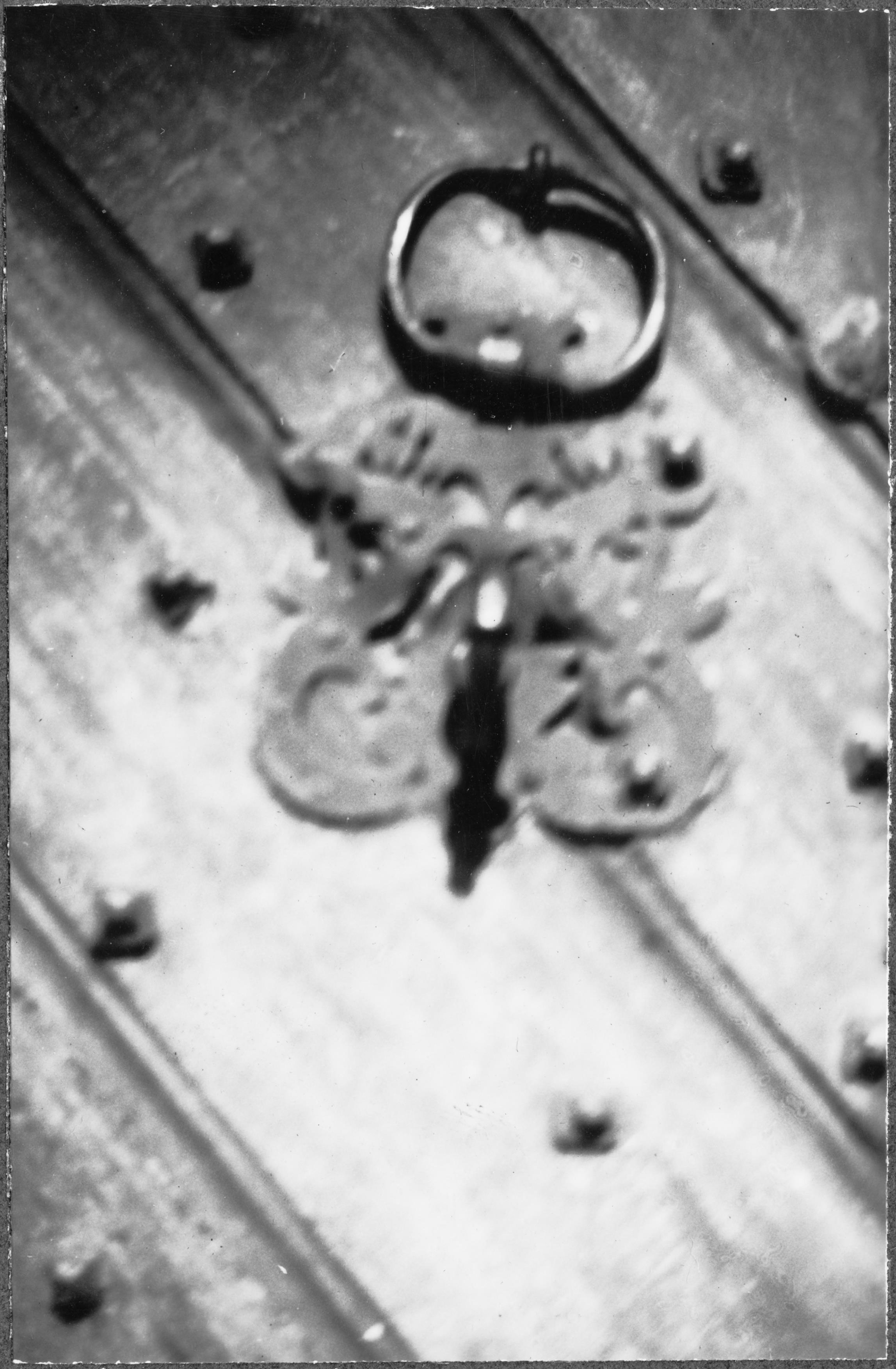 Järnbeslag för nyckelhål och dörring på västra ingångsdörren.