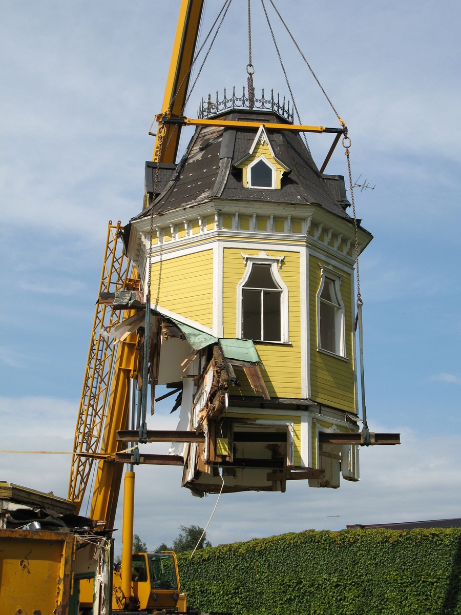 Titel: Strömsborg. Rivningen av huset och lyftet av tornet för flytt.