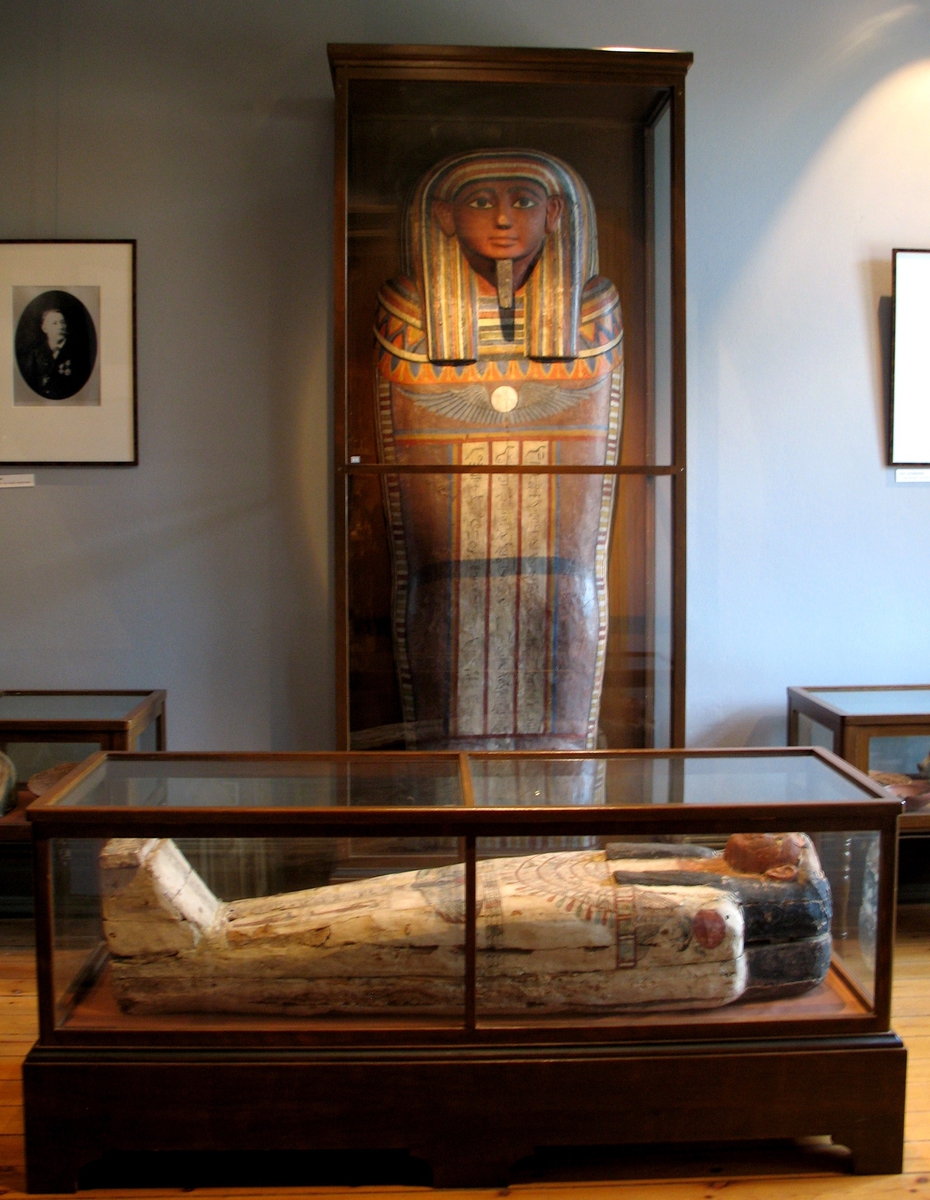 Egyptiska salen på Vänersborgs museum. Innehåller ett stående mumielock samt en liggande mumiekista innehållande den falska mumien.