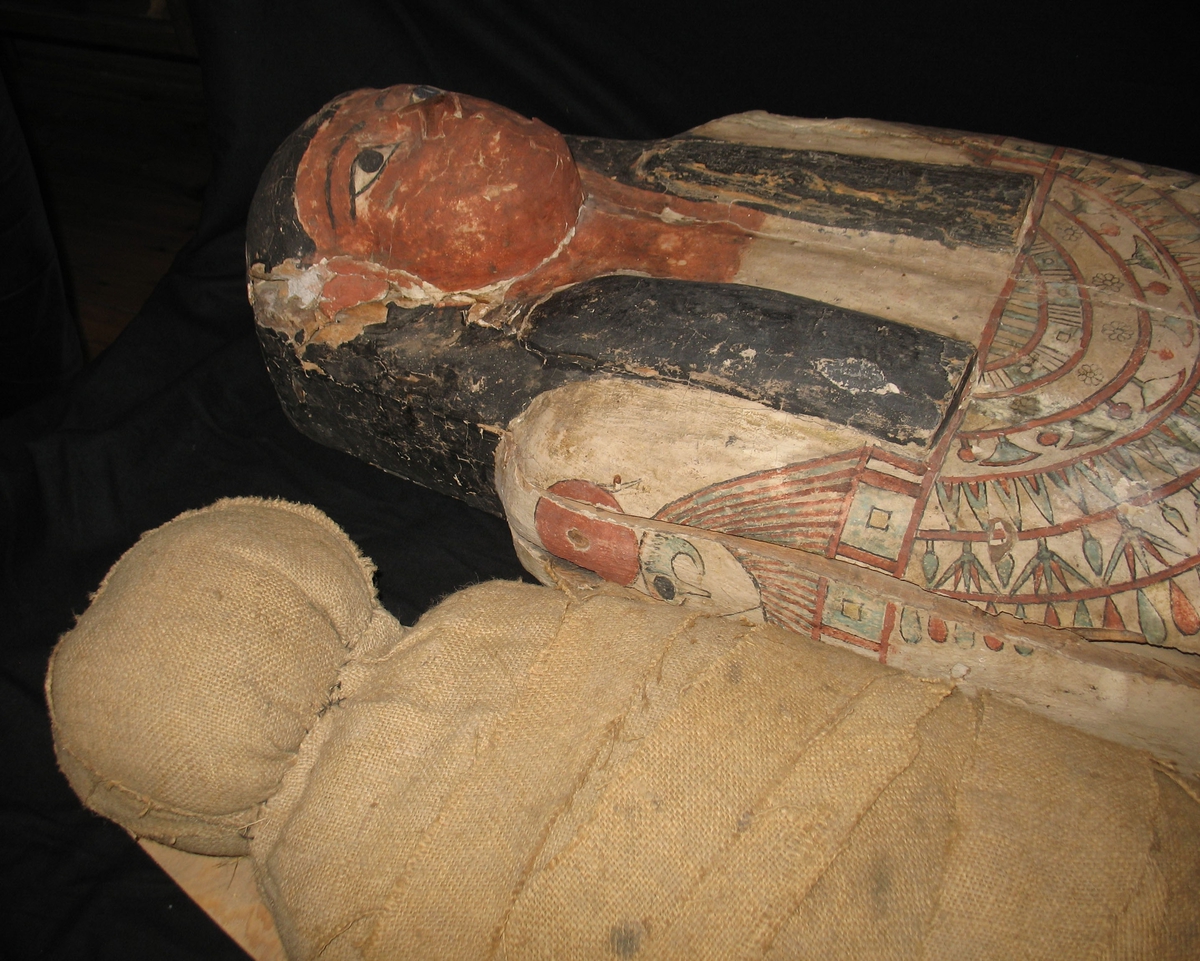 Vänersborgs museum. Den falska mumien tillsammans med mumielocket.