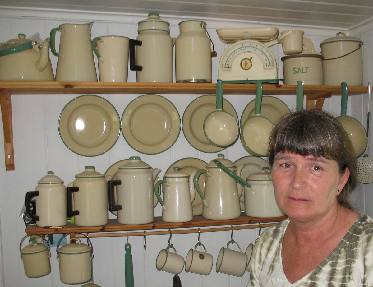 Frändefors. Anette Vilson fotograferad med sin samling av Kockumskärl.