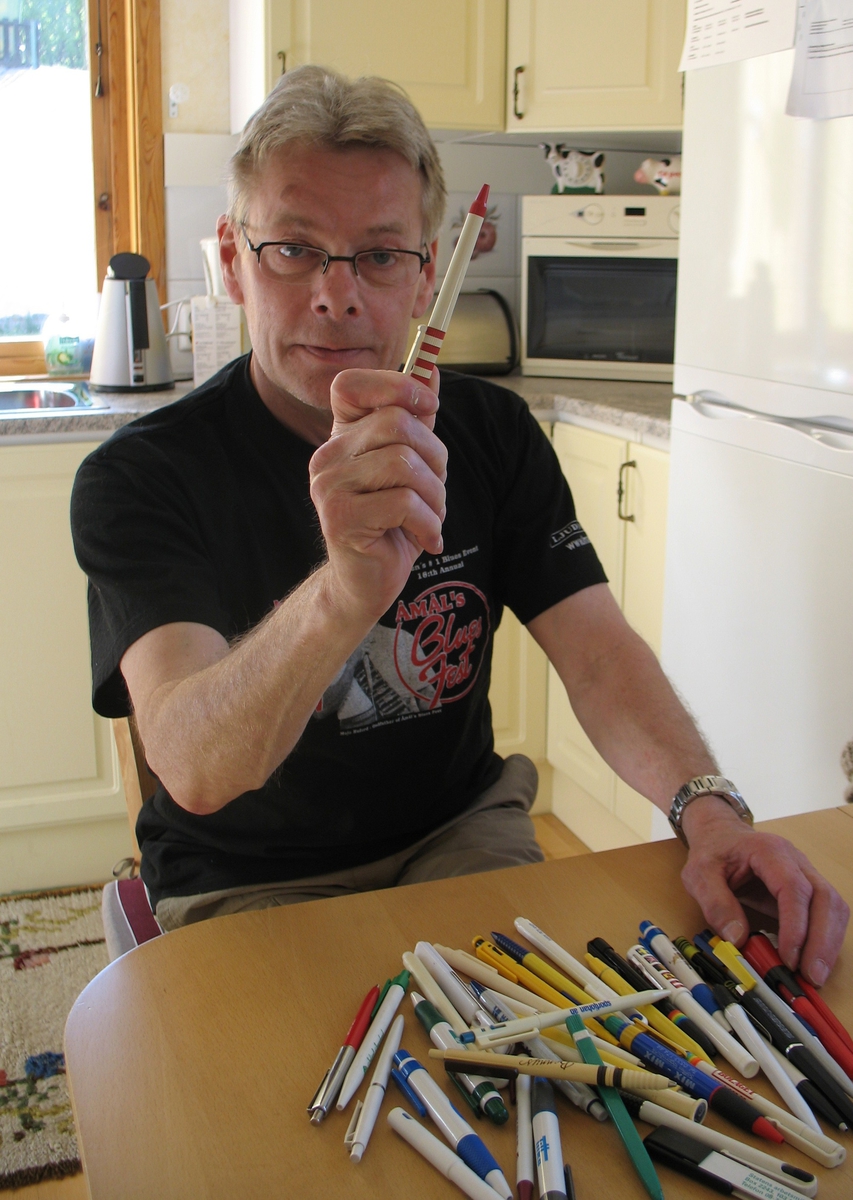 Frändefors, John Wiman fotograferad med sin samling av kulspetspennor.