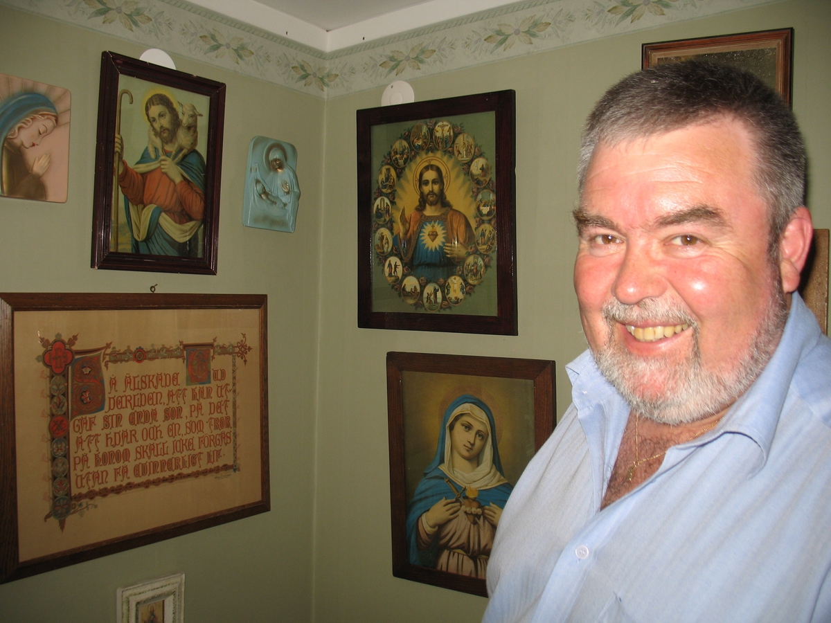 Tommy Gustafsson fotograferad med sin samling av religiösa tavlor. Lerum
