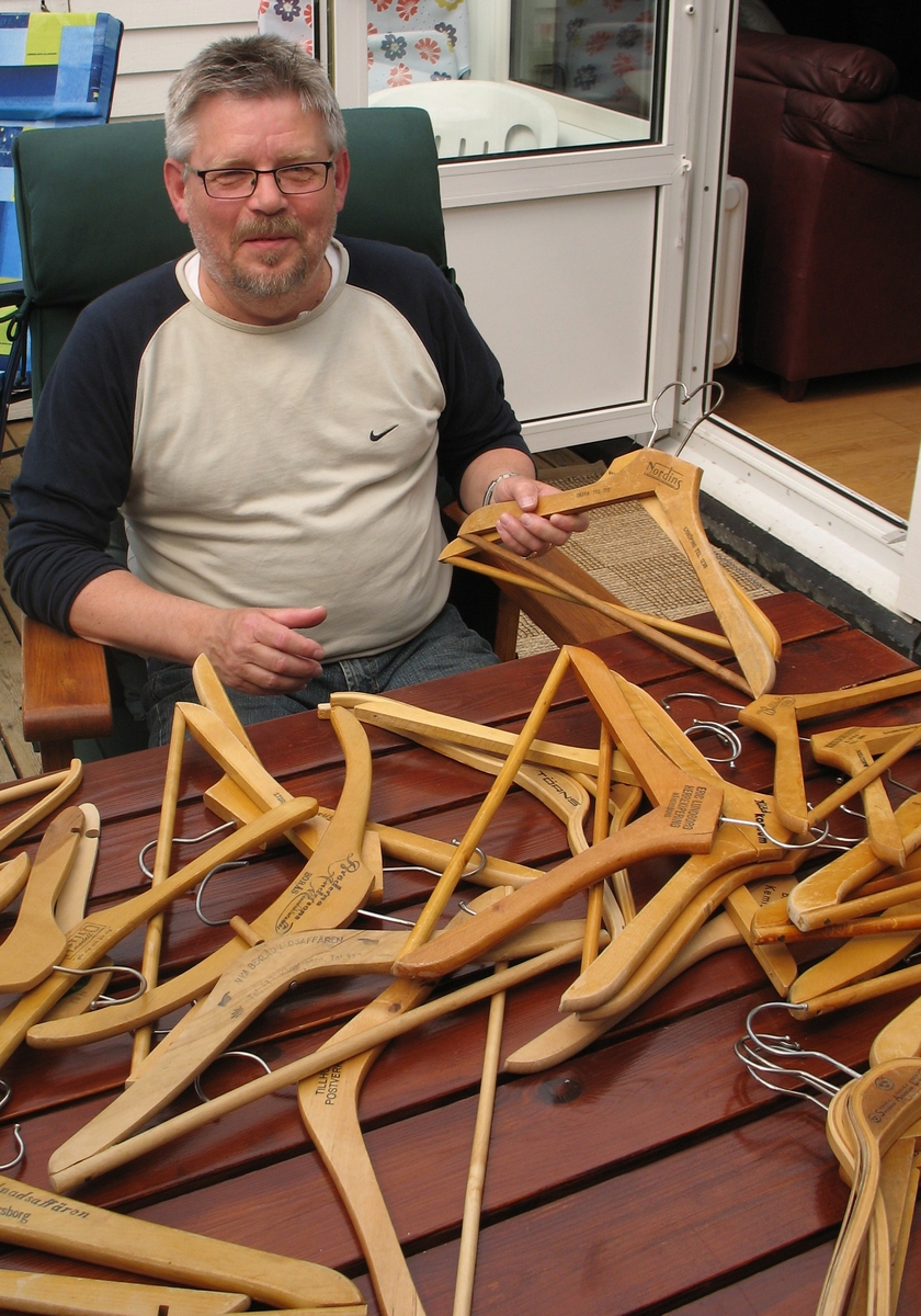 Tommy Norrman fotograferad med sin samling av klädgalgar. Vänersborg