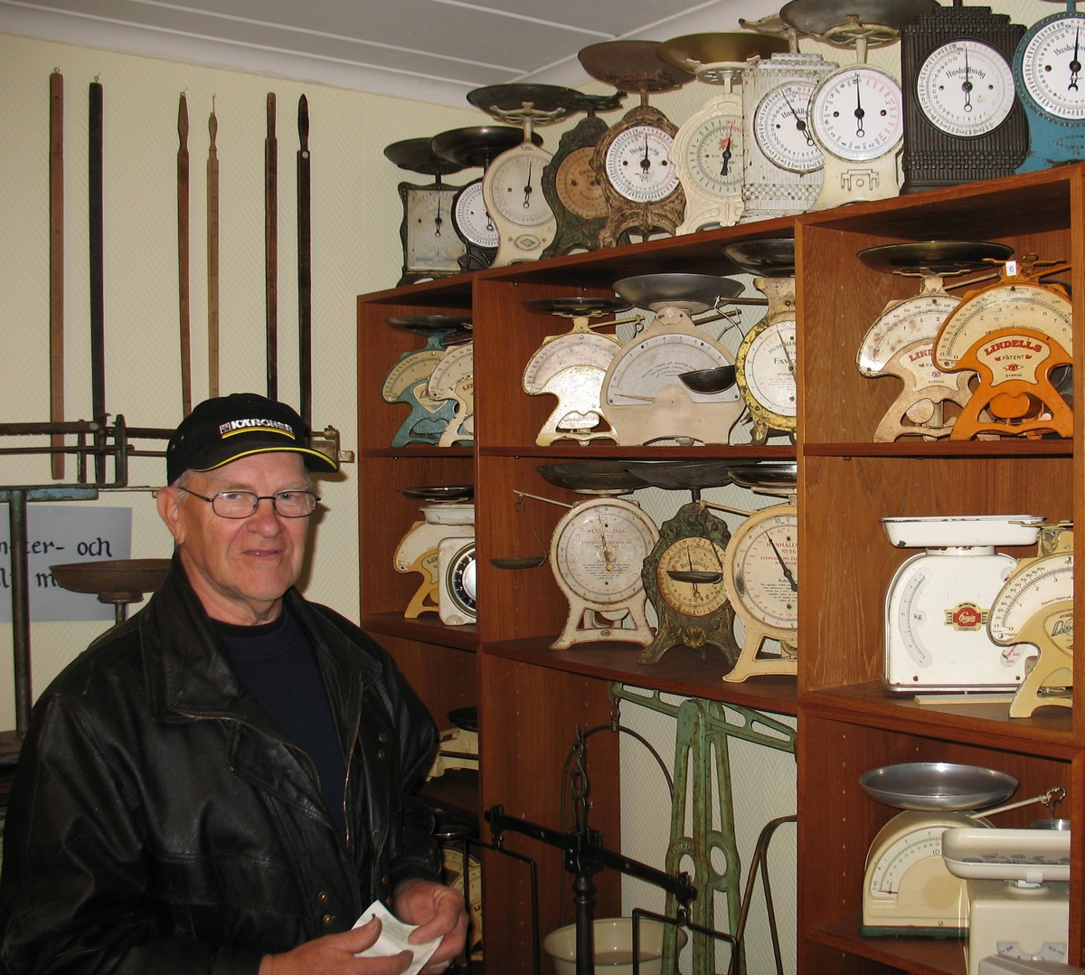 Tore Johansson fotograferad med delar av sin samling av vågar. Vårgårda