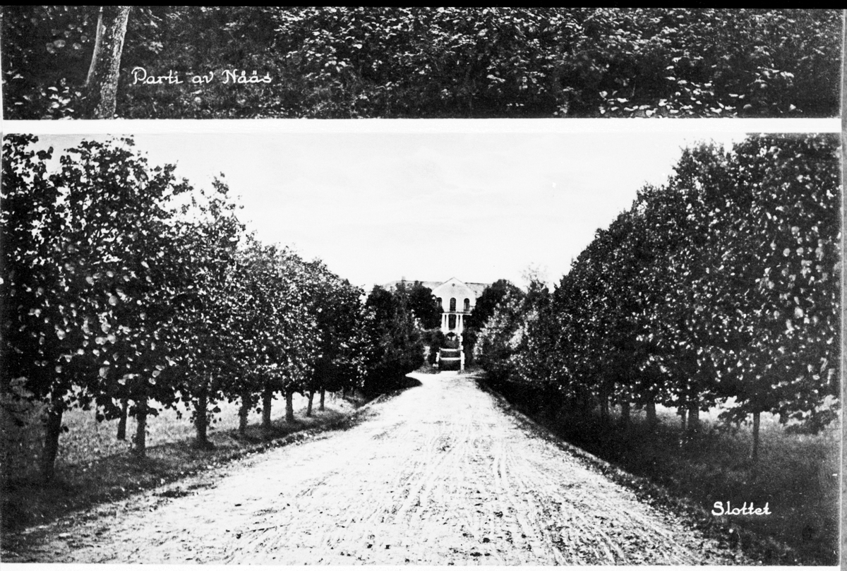 Vykortshäften. Vy genom allén mot slottet och vy från slottsplanen mot slottet. Nääs
