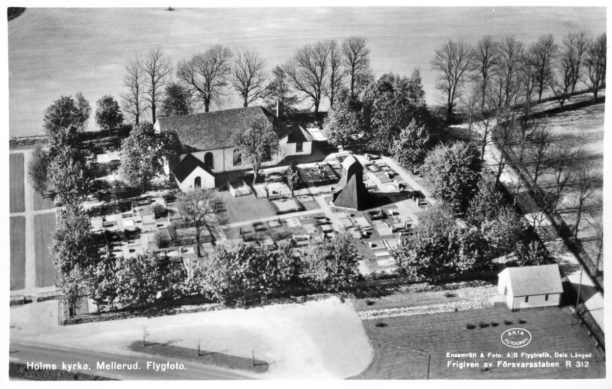 Text på foto: "Holms kyrka Mellerud, Flygfoto"