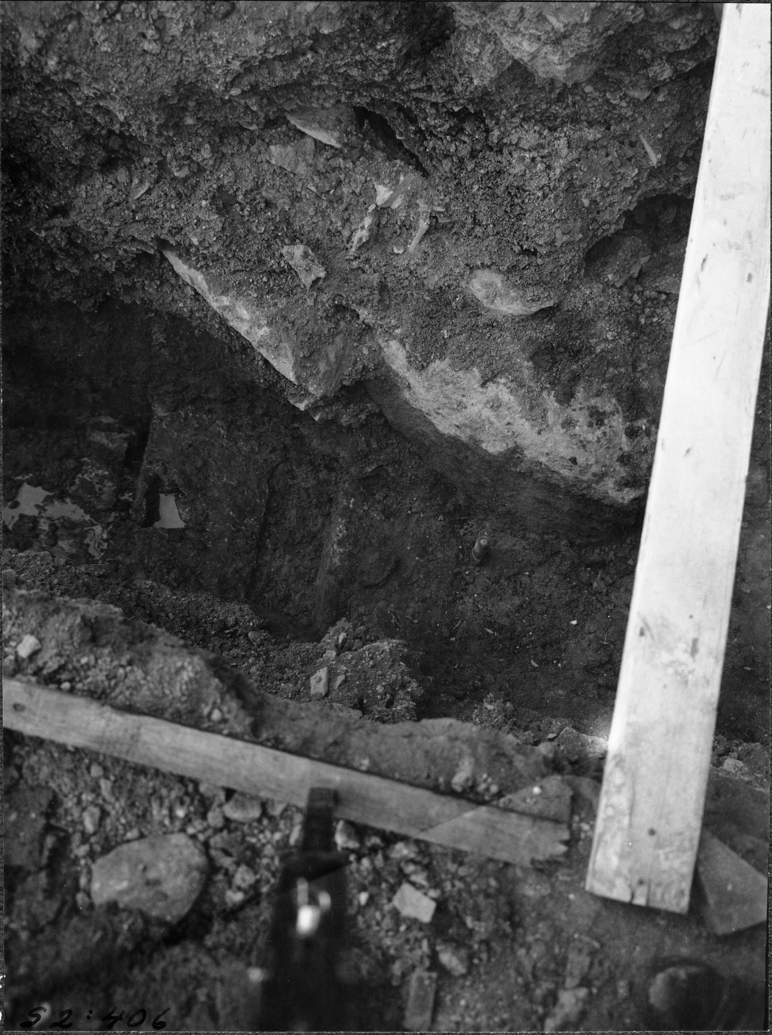 Grävning utanför kyrkan, schakt E, mittpartiet från väster.