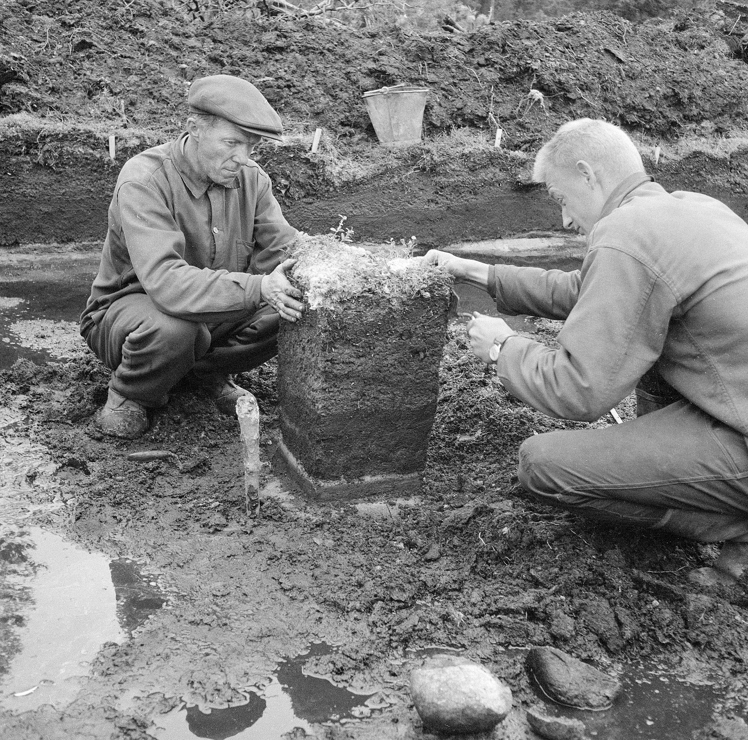 RAÄ-nummer Arjeplog 508:1. Hornavan. Lokal 940. Gustav Lundmark och Arne Mattsson hjälps åt med en sista finputsning av ett jordprov från myren. Torvpelaren är utskuren ur vänstra kanten av härd 23.