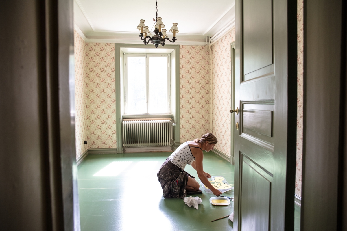 Vänersborgs museum. Schablonmålning av golvet i vaktmästarbostaden.