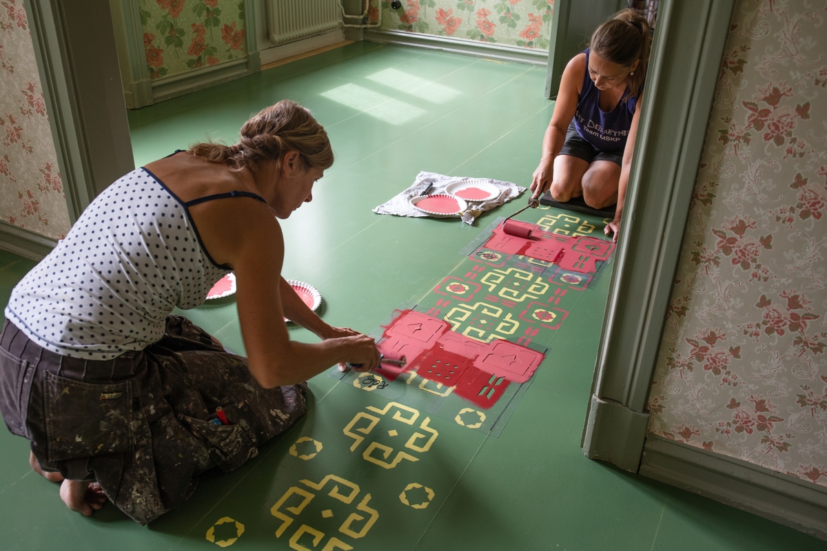 Vänersborgs museum. Schablonmålning av golvet i vaktmästarbostaden.