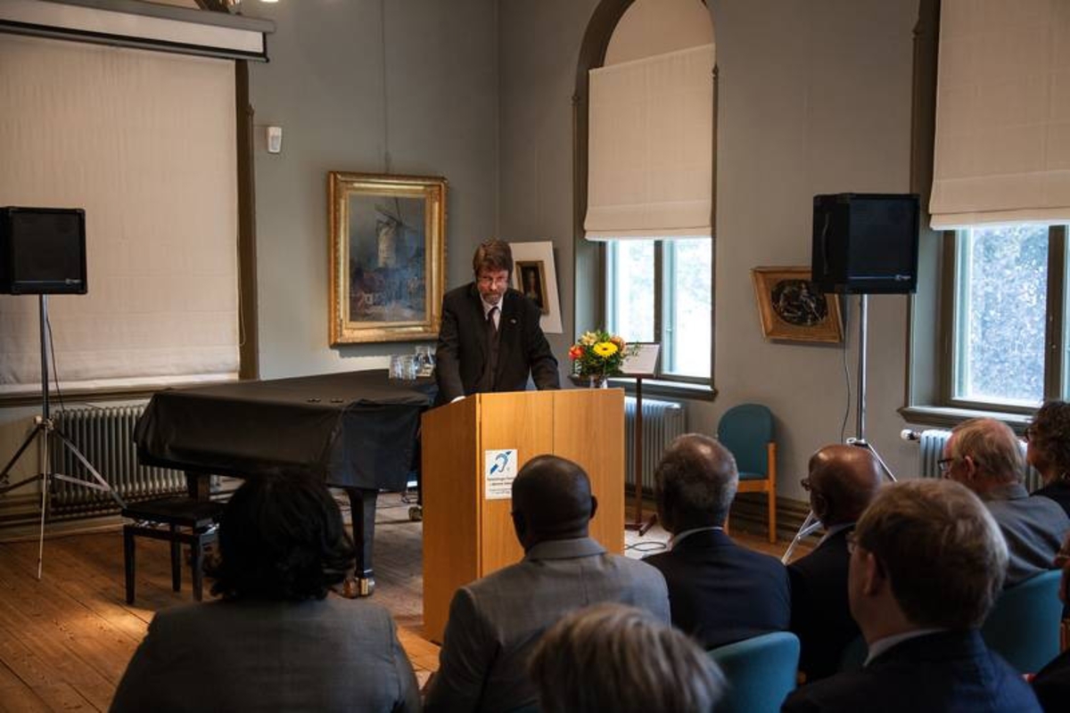 Invigning av utställningen Ambassadör Brito António Sózinho, Embassy of Angola, Stockholm. Sten Rylander, f.d. svensk ambassadör i Angola, Namibia, Zimbabwe och Tanzania.