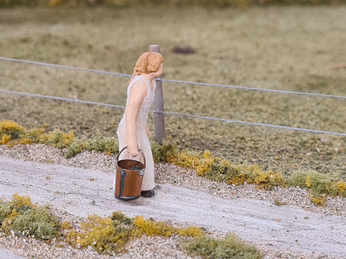 Dalslandsgård. Vinnsäter, Järbo socken. Detalj av modell, kvinna på väg till brunnen efter vatten