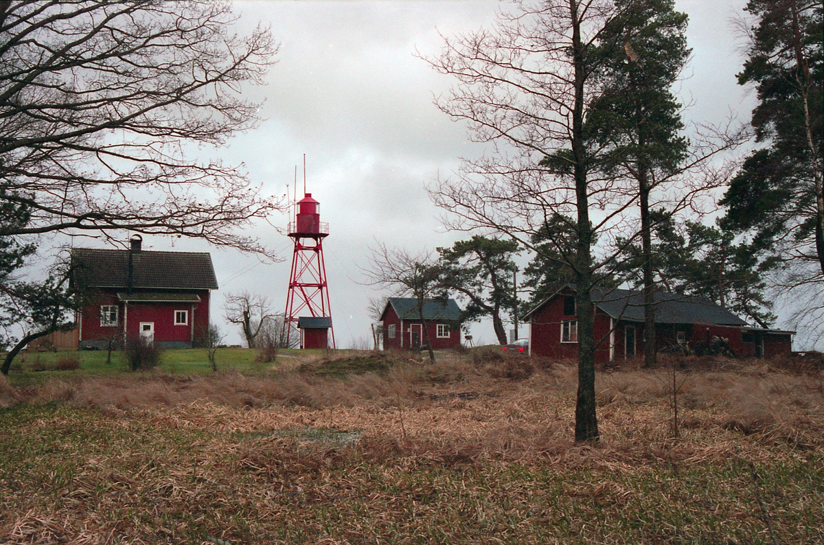 Gälleudde fyrplats. Bostadshuset, oljeboden, fyrtornet och maskin och tyfonhuset, uthuslängan från V