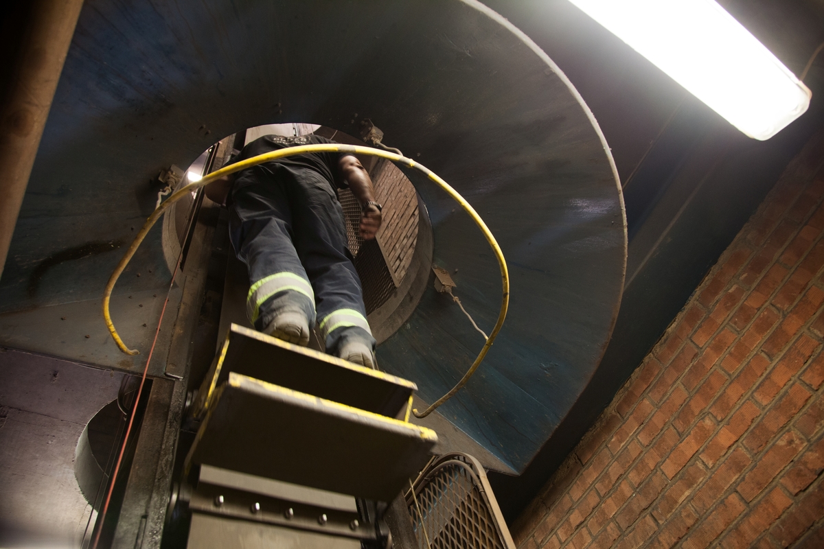 Vargön Alloys AB. Dick Fransson demonsterar hur manliften fungerar