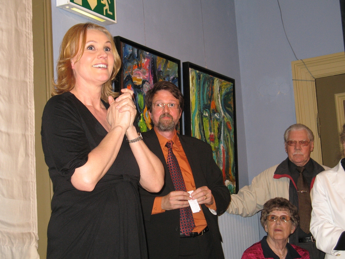 Konstnär Birgitte Söndergaard vid invigningstalen under vernissagen av utställningen av Från Lilla Paris till Louvren på Vänersborgs museum 2009-04-25.