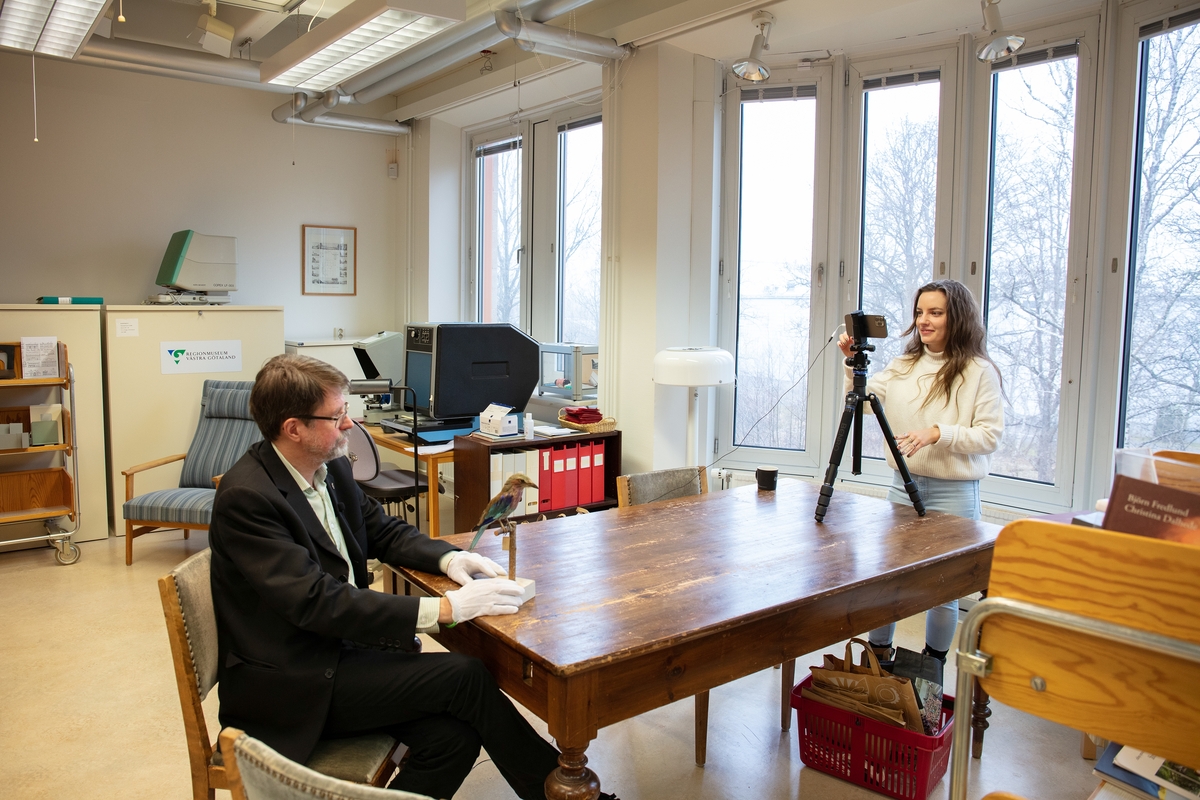 Vänersborgs museum. Kulturlagret, biblioteket. Anna Härdig och Peter Johansson spelar in " fredagsfilm" för museets Facebook och hemsida.