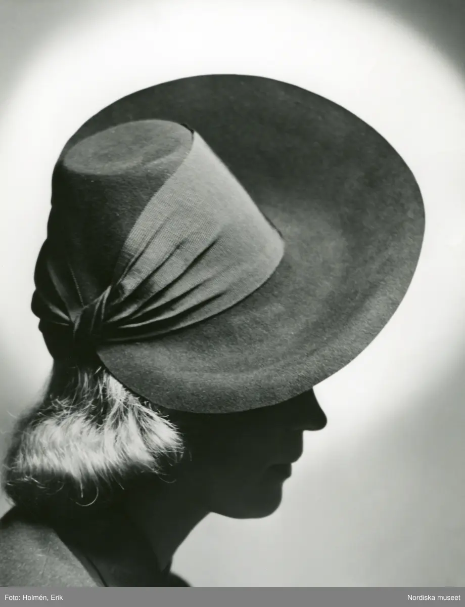 Porträtt av kvinna i uppslagen hatt med brett hattband, från Rose Descat.