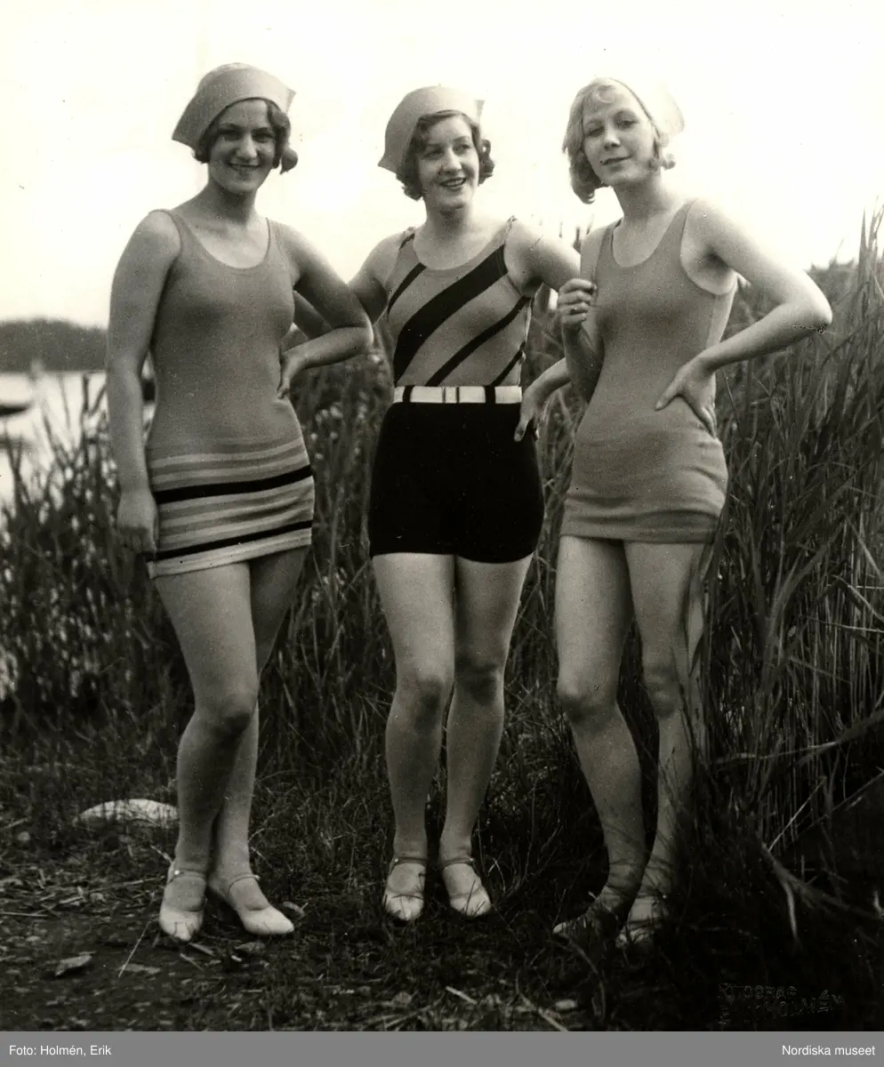 Nordiska Kompaniet, badmode. "Uppvisning i Saltsjöbaden". Tre modeller i baddräkt.