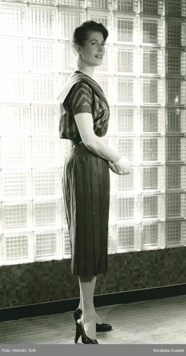 EM, Modellbutiken, Damkonfektion. Modell i randig blus, veckad kjol, pumps och handskar, står framför vägg i betongglas.